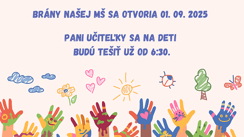 SLEDUJTE OZNAMY NA STRÁNKE !!! OTVORENIE MŠ BUDE REÁLNE PO ĎALŠÍCH TESTOVANIACH a VYJADRENIACH RÚVZ.